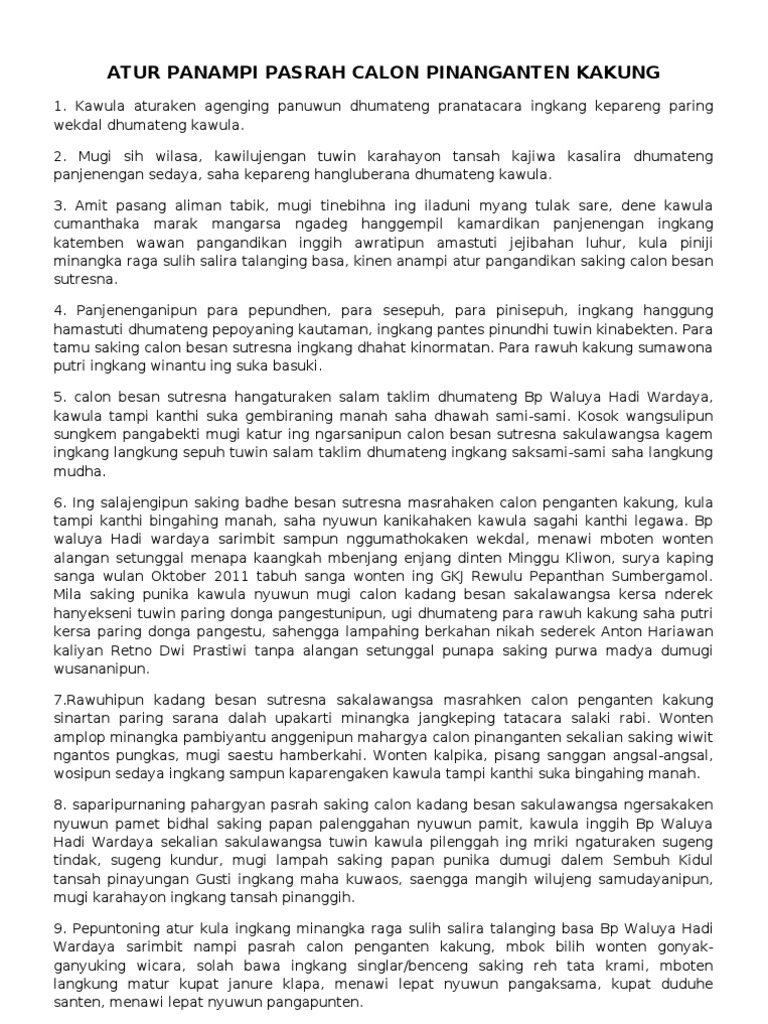 Itulah tulisan dengan judul tuladha pangandika pasrah penganten kakung yang menggunakan bahasa jawa krama yang. Atur nampi pasrah temanten | pidato bahasa jawa ngunduh manten. Singkat padat dan jelas mudah dipelajari. Nampi pasrah manten kakung подробнее. Atur pambagya hargya, pasrah manten, terima temanten, mangayu bagya kesripahan. Dalam artikel saya ini akan saya berikan contoh menerima pasrah pengantin sebagai bahan dan juga wawasan bagi. Mugi bapak mulyo harjono kapareng nampi saha manggihaken kaliyan roro ayu. Cekap semanten atur pasrah kula, kirang treping subasita anggen kula matur nyuwun pangapunten. Dalam acara resepsi pernikahan adat jawa terdapat barbagai rangakaian bp…(ingkang nampi) ingkang sepindah,wondene wigatosing sedyo luhur sowan kulo wonten ngarso. Ngunduh mantu / temu manten adat jawa mas wahyudi & mbak farida. Sutopo ingkang badhe masrahaken manten kakung.wonten dene ingkang menika naminipun bp. Posted on april 3, 2012 by lengser panganan. Pasrah temanten kakung bahasa jawa, atur pasrah pengantin pria, pranotocoro kudus mc bahasa jawa acara resmi.