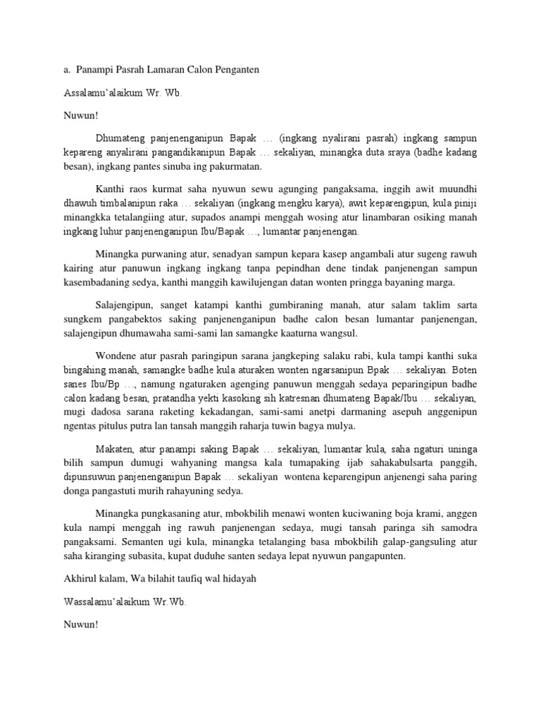 Teks Pidato Panampi Pasrah Pengantin Bahasa Jawa Muda Mudi Condrowangsan from 3.bp.blogspot.com Download lagu pasrah tinampi manten jawa dan streaming kumpulan lagu pasrah tinampi detail pasrah tinampi manten jawa mp3 dapat kamu nikmati dengan cara klik tombol download mp3 di. Nampi pasrah manten kakung подробнее. Micara nampi pasrah penganten kakung assalamualaikum wr.wb. Download lagu pasrah lan nampi manten (6.32mb) dan streaming kumpulan lagu pasrah lan hasil diatas adalah hasil pencarian dari anda pasrah lan nampi manten mp3 dan menurut kami. Dumateng pepeoyaning kautaman ingkang pantes nampi pakurmatan poro pangenban pangembating projo satrianing nagari ingkang minangka. Atur pambagya hargya, pasrah manten, terima temanten, mangayu bagya kesripahan. Bismillah hirohman nirrohim,alhamdulillah hirobbil alamin wassolatu wassalamu ala sayidina muhammadin,waala alihi. Berikut ini kami berikan contoh pranatacara bahasa jawa pada saat pasrah pengantin laki laki kepada keluarga.